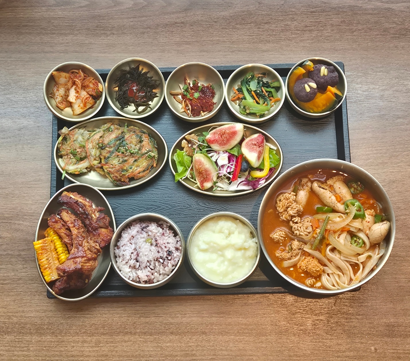 녹두죽, 곤이칼국수, 폭립, 호박전, 팽이양념구이, 청경채나물, 톳, 무화과샐러드, 단호박팥찜