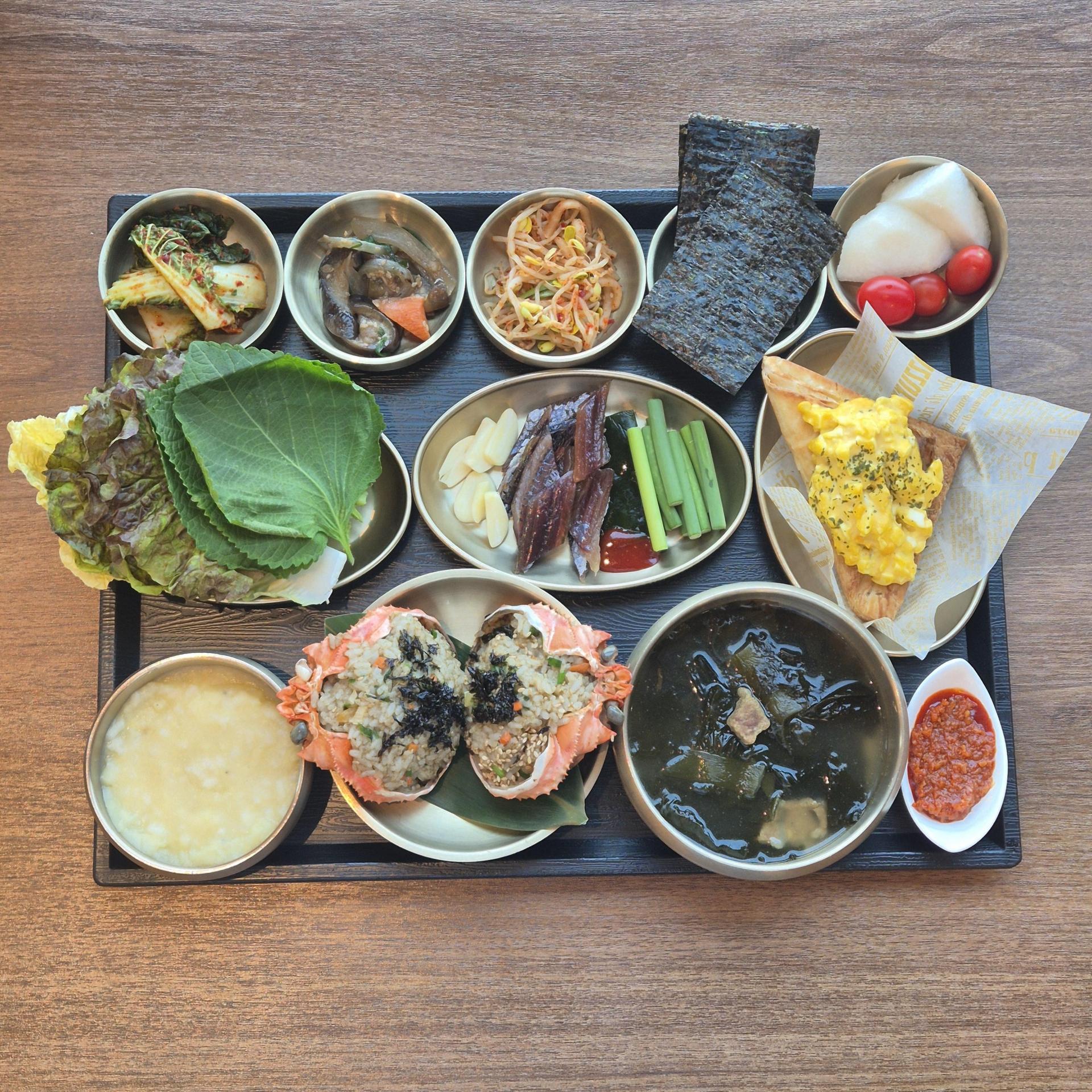 게딱지볶음밥, 녹두죽, 소고기미역국, 과메기, 패스츄리에그샌드위치, 콩나물무생채, 가지나물, 파래김, 쌈채소, 과일
